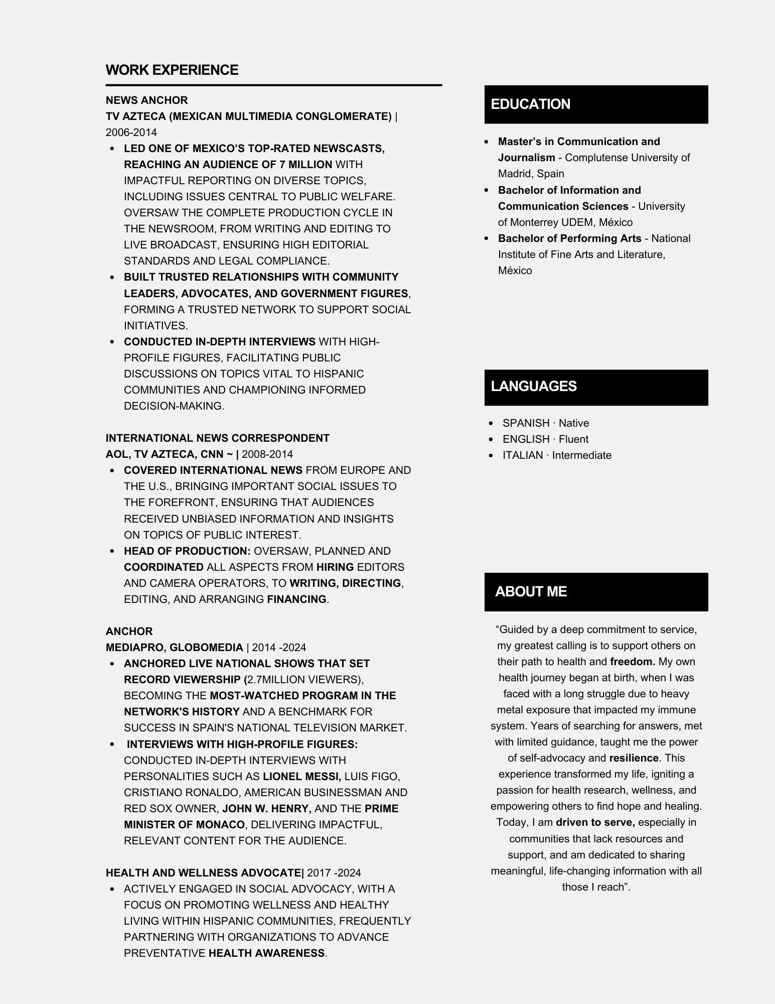Eva has since become a powerful advocate for wellness, health sovereignty, and community empowerment. Her extensive media experience spans top networks across Mexico, the United States, and Europe, including TV Azteca, CNN, ESPN, beINsports and Mediapro, where she reached millions of viewers with impactful reporting. In Mexico, Eva anchored one of the nation’s highest-rated newscasts, reaching 7 million people and covering topics central to public health and welfare. She later set record viewership in Spain, drawing 2.7 million viewers to a national program—demonstrating her ability to communicate powerfully and build trust with diverse audiences.